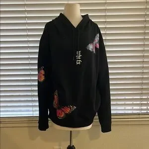 Embrace style and comfort with this black hoodie sweater featuring vibrant butterfly designs. Perfect for casual outings.