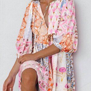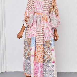 Multicolor Bohemian Women's Lantern Sleeve V Neck Tie Pockets Maxi Dress