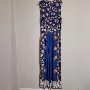 Farm Rio Anthropologie Blue Floral Wide Leg Jumpsuit Medium