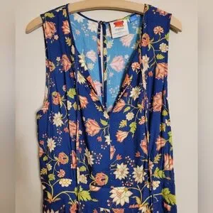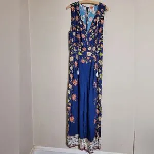This Anthropologie jumpsuit features a vibrant blue base adorned with a lively floral print, offering a bohemian charm. The sleeveless design and wide-leg silhouette ensure a relaxed fit. Perfect for summer outings, this jumpsuit combines style and comfort effortlessly.
