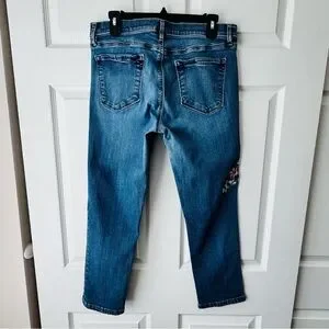 These LOFT Modern Cuffed Crop Jeans (Size 10) feature a stunning embroidered crane and floral design on the left leg—an eye-catching detail that elevates this classic mid-wash denim. Made with stretch for comfort and a flattering fit.