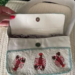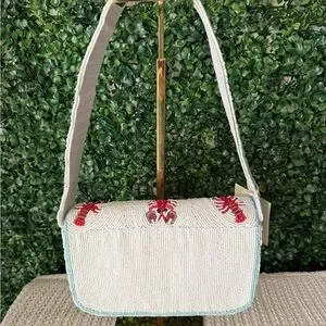 Chic and playful shoulder bag featuring lobster embroidery. Perfect for adding a touch of fun to any outfit. The white and red design makes it a versatile accessory.