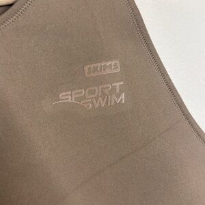 The swimsuit is made of a blend of polyester and spandex, providing both durability and comfort. The Skims logo accent adds a touch of style to this functional piece. The one-piece jumpsuit design is both practical and fashionable, making it a great addition to any swimmer's wardrobe.