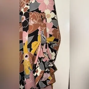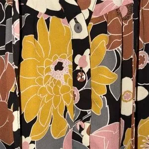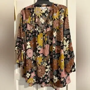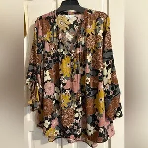 Elegant top by DR2 Daniel Rainn with boho floral pattern in lovely colors! Features pink, yellow, and cream hues. Ideal for a fashionable outfit.