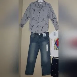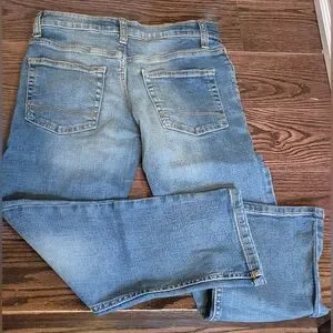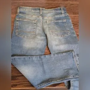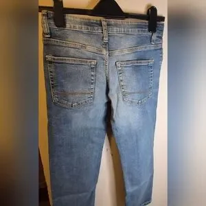 These Cat & Jack jeans (kids size 8) feature a timeless straight-leg design in a versatile blue shade, perfect for everyday wear. Crafted from durable denim, they offer a comfortable fit with a classic aesthetic. The jeans showcase subtle whiskering and fading for a stylish, lived-in look. Inseam 23"; waist 28". It is also stretch/elasticized and adjustable waist.