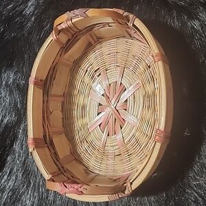 Charming bamboo basket with colorful painted accents. Features a natural woven design with handles. APPLES & WORMS DESIGNED. VERY BEAUTIFULLY DESIGNED AND CRAFTED. OVAL SHAPED BASKET.