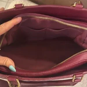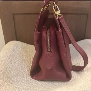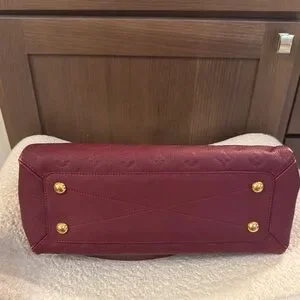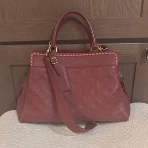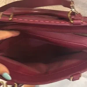 This Louis Vuitton bag in a striking red hue combines elegance with functionality. Its structured design and luxurious craftsmanship make it a standout accessory for any occasion. The bag's sophisticated appearance is enhanced by its high-quality materials and timeless style. Some wear on corners as shown. Euc