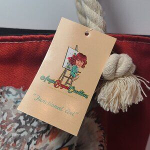 NWT Make a bold and artistic statement with this stunning owl tote featuring the original artwork of Angie Bryan. This one-of-a-kind functional piece showcases a detailed owl illustration, set on a durable red canvas with chunky nautical-style rope handles.