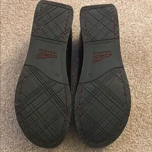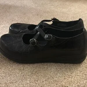 Offers Welcomed! Experience all-day comfort with Dansko's black flats, featuring a durable rubber sole and a sleek leather finish. These shoes are designed for everyday wear, offering a casual yet stylish look with a single strap and round toe design. Perfect for those seeking a blend of practicality and elegance in their footwear.