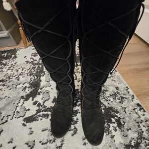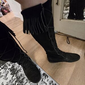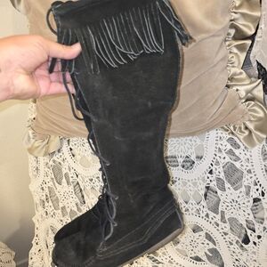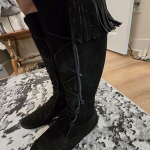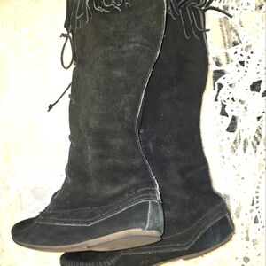 Minnetonka, Black Suede, Lace Up Front Knee High Boots, Fringe, Mens 9