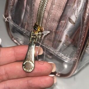 Elevate your accessory game with this chic 3-piece handbag set from Vince Camuto. Featuring a clear outer tote, a pink and gold floral zip pouch, and a shiny pink brush bag, this set is both stylish and functional. Perfect for travel, daily use, or gifting! Never even been opened, the zipper is still tagged to be closed!