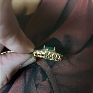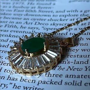 This stunning necklace features a vibrant green pendant set in a luxurious gold frame. Perfect for adding a touch of elegance to any outfit. This is a well-made piece of costume jewelry I believe it to be glass and possibly lucite to look like a green emerald pendant, but it is either plastic or glass. In my opinion. It is marked 18 karat gold plated, but I cannot guarantee that that is what it is. I bought this from another poshmark seller. It’s well-made, very pretty and it’s just a very nice piece of costume jewelry. It is not expensive jewelry. It is faux and fun.