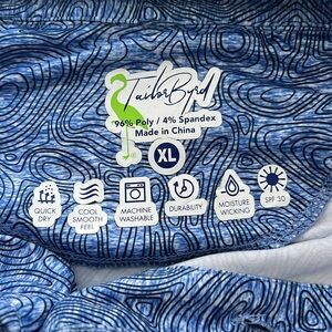 Stay cool and dry with this fun blue swirl patterned Tailorbyrd polo shirt. The lightweight breathable fabric is perfect for golfing, vacationing, or any activity. Features a three button placket, embroidered flamingo on upper back, moisture wicking fabric, and SPF 30 sun protection.