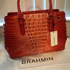 Brand New Embrace Small Finley perfect for work or daily bag. Beautiful color for holiday months July, December, or a soft red for year round. Finley’s are one of the very few bags Brahmin makes that has a compartment in the center..