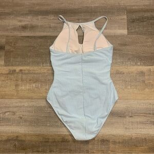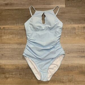 Ellen Tracy One Piece Swimsuit Seersucker Ruched High Neck Keyhole Striped 10