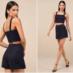 Lulus Elevated Attitude Navy Two-Piece Set with Top and Skort! Textured tweed fabric. Matching high-waisted skort with hidden zipper/clasp at back. This is a beautiful, chic set and material feels high-quality and looks very expensive. Size XS. Never wore with tags. I absolutely love the look and plan to order it another size. I am usually between XS or S, this fit me but was a bit too snug for me at the waist (I have a wide rib cage). Material is very comfortable but does not have a lot of stretch. For reference I am 5'4, 118 lb. and usually a size 2 or 4.