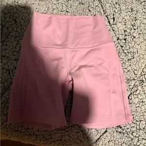 These pink bike shorts from lululemon athletica feature a high-rise waistband and a fitted design, perfect for cycling or gym workouts. Made from a smooth, moisture-wicking fabric, they offer both comfort and style for any athletic activity.