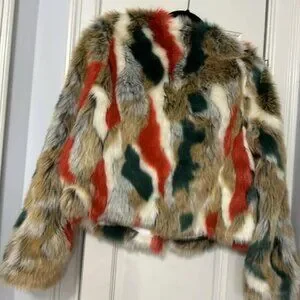 Wrap yourself in luxe warmth and head-turning style with this multi-color faux fur jacket. This beauty features a bold abstract colorblock design in camel, cream, burnt orange, deep green, and charcoal black, all in ultra-soft faux fur that feels like a cozy hug.