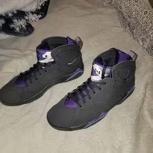 Step into the world of iconic basketball fashion with these Jordan sneakers, featuring a striking black and purple colorway. The high-top design offers ankle support, while the Jumpman logo adds a touch of authenticity. Perfect for both casual outings and athletic activities, these sneakers are a stylish addition to any wardrobe.