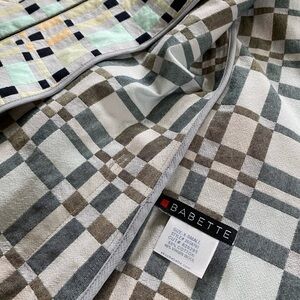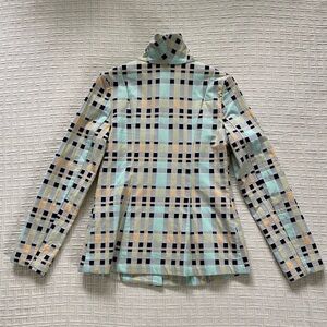 Beautifully constructed. A lightly textured grey background, with black, mint, peach & tan square designs. Hidden front zipper closure, with an asymmetrical, mandarin collar. Two front flat pockets. Iconic, upscale designer known for her unique use of symmetry & pleats. Cotton & virgin wool.