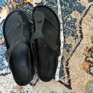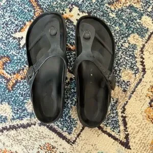 Classic Birkenstock sandals. Sleek black design. Comfortable and stylish.
