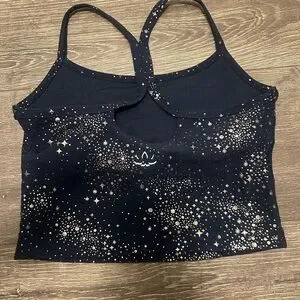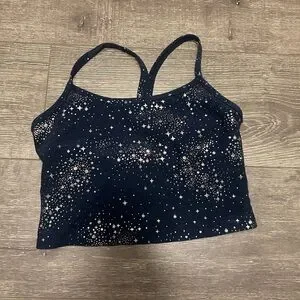 Midnight blue crop top with delicate silver star pattern. Features comfortable spaghetti straps.