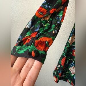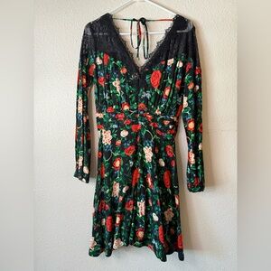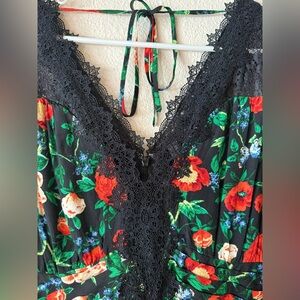 Features/description: Gorgeous floral pattern with black background Flowy swing skirt Lace detail on the shoulders and neckline V neck front and back and tie detail at back Zip closure Gathering at the waist Approx measurements: Armpit to armpit 17.5 inches Body length 33 inches, no stretch
