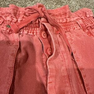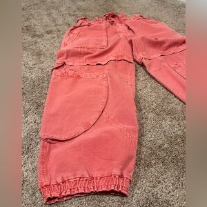 Button fly, elastic waist with draw string, large side pockets and zippered legs to concert these pants into shorts.