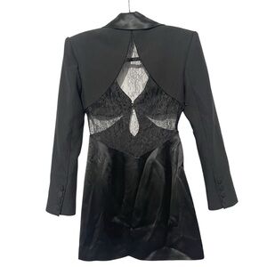 This blazer dress will give you a fierce look with tons of attitude. Featuring a classic black fabric, lace, with an asymmetric design and satin lapel detailing, style with heels and a pendant necklace for a chic weekend vibe.