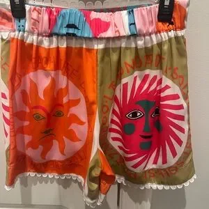 NWT Stylish shorts with a mix of pink and multicolor patterns. Comfortable and trendy. Elastic waist in back, measures 14.5” flat with 5” inseam