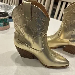 Elevate your style with these Soda heeled boots, featuring a striking gold finish and classic Western-inspired design. The boots boast a pointed toe and a Cuban heel, perfect for making a statement. Crafted with attention to detail, they offer a blend of glamour and tradition.