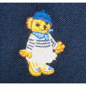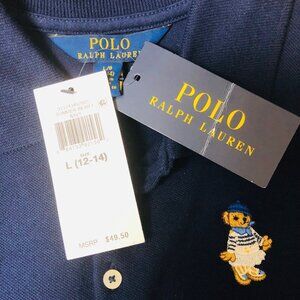 1347. Polo Ralph Lauren. New With Tags. Navy Blue. Polo Dress. Button placket. Short sleeves. Ribbed collar/cuffs. Embroidered logo. Polo Summer Bear. Retail $49.50. Cotton/Elastane. Size Large (12/14). Shoulder 13.75. Bust 32. Length 31.5. Experienced seller.