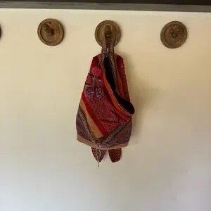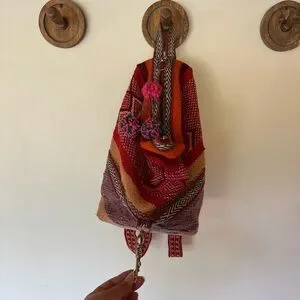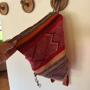 Vibrant woven backpack with intricate patterns. Features shades of red, orange, and purple. Perfect for adding a pop of color to any outfit. Bag measures 16x13x5
