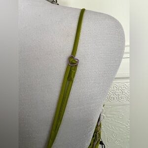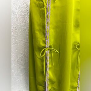 Elegant satin gown in vibrant green with the cutest purple details throughout. Perfect for formal occasions.