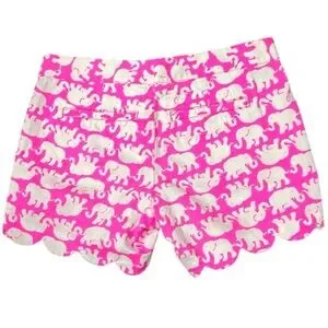 Lilly Pulitzer women's low-rise shorts, specifically the "Buttercup" style, featuring a vibrant pink and white elephant print with a scalloped hem. The shorts are made from a comfortable stretch fabric and have a low rise with a flat front.