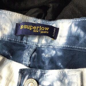 Trendy Levi's jeans with a blue and white tie-dye pattern. Perfect for casual wear.