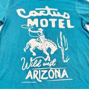 EUC Teal short sleeve tee with 'Cactus Motel' graphic. Features cowboy and cactus design. Fun and stylish for kids.
