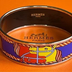 Experience the luxury of Hermes with this exquisite enamel bracelet, showcasing a vibrant blend of blue, yellow and orange hues. Crafted with meticulous attention to detail, this accessory features the iconic Hermes branding and a glossy finish, making it a standout piece in any jewelry collection.