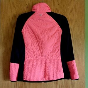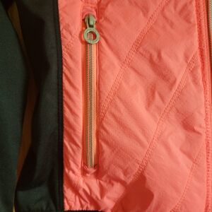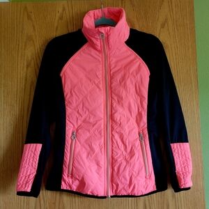Sleek Calvin Klein zip front jacket. Coral front with black sleeves. Lightweight. Side zip pockets.