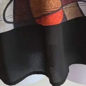 This colourful abstract design features red, grey, orange, brown, and black motifs. This design evokes a timeless elegance.