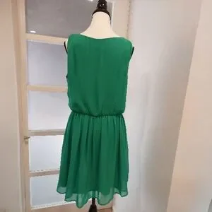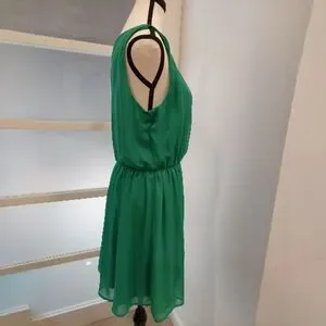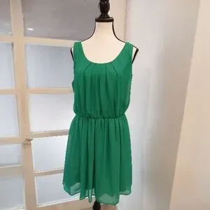 This charming green mini sundress features a playful blend of ruffled and smocked elements, ideal for attending weddings. The sleeveless design with a scoop neckline provides a chic and airy feel, making it a stylish choice for any special occasion.