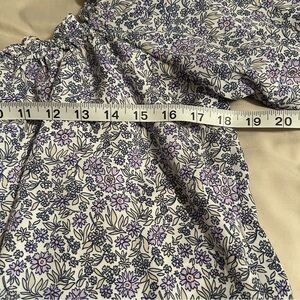 Periwinkle and white ditsy floral printed crop blouse with off the shoulder square neckline, blouson sleeves. Top has mother of pearl buttons along the front. Made of 100% polyester, machine washable.