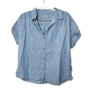 Faherty, striped shirt, button down shirt, short sleeve, casual top, blue and white, womens shirt, size M, tencel linen, summer shirt, beach shirt, lightweight shirt, relaxed fit, vacation shirt