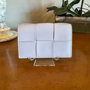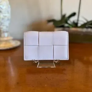 Bottega card holder, purple lambskin wallet, oyster grey wallet, small Bottega wallet, mini designer wallet, lavender luxury card case, Bottega woven leather, Italian leather wallet, Bottega Veneta Intrecciato, compact luxury wallet