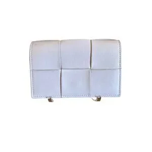 Elegant Bottega Veneta Maxi Intrecciato card holder in lambskin leather, in a rare Oyster Grey (light lavender/purple) color. Features iconic woven construction, burnished edges, press-stud closure, and compact interior with card and note slots.