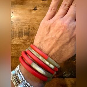 Summer ready with this instant stack of perfection. Set of stylish red and cream bangles by Sunshine Tienda. Perfect for adding a pop of color to any outfit. Poolside and beach safe. New with tags!