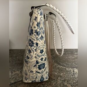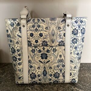 This Patricia Nash tote bag showcases a sophisticated blend of blue and white hues, crafted with a structured design that exudes elegance. Its spacious interior and versatile carrying options make it an ideal choice for both casual outings and formal occasions.