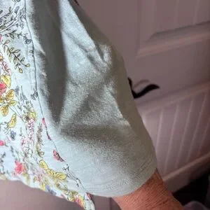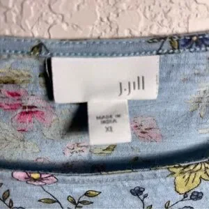 This relaxed blue tunic from J. Jill features a boxy silhouette with 3/4 sleeves, offering a comfortable and stylish fit. It has contrasting blue fabric on the sides. Tge field of flowers gives it a cottage feel. The soft fabric and flowing design make it an ideal choice for casual outings. Its versatile style pairs well with various bottoms for a chic, effortless look.
