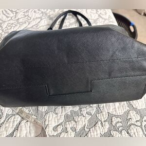 3 main pockets with large center zip pocket that separates the 2 main slip pockets. The front slip pocket has a snap enclosure pocket with 2 small front pockets. The back slip pocket has a zip closure pocket with 2 small front pockets. Exterior: Front and back pockets with magnetic closures Measurements: Strap drop: 9" Height: 9" Width: 11.75" along the bottom, 14.5" along the top Depth: 6" black exterior blue interior