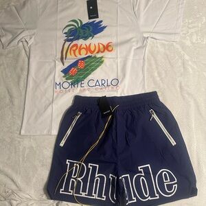 Rhude Whits Shirt and Blue Athletic Shorts with Bold Branding